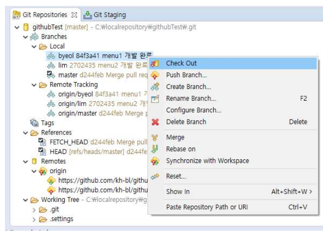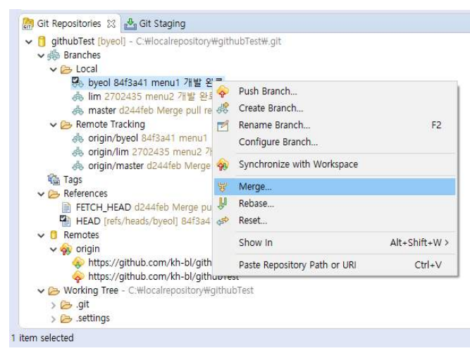 새로운 Branch로 작업 한 내용을 원격 저장소에 반영 시키기 위해 우클릭 > Team > Add to Index 클릭