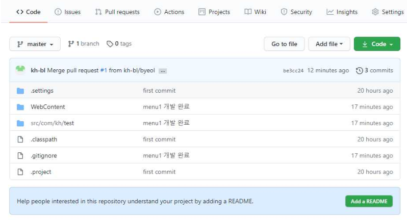 원격 저장소에 접속하면 first commit의 결과가 올라와 있는 것을 확인할 수 있음