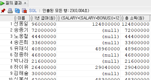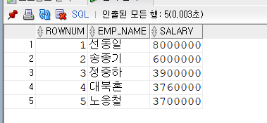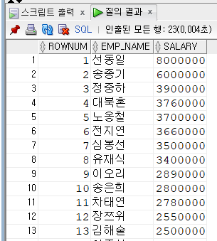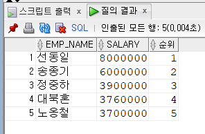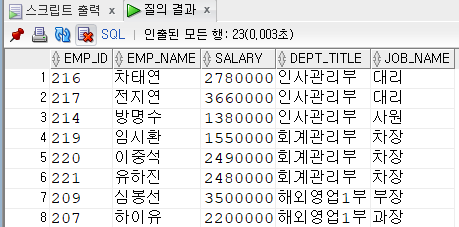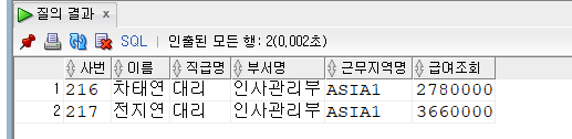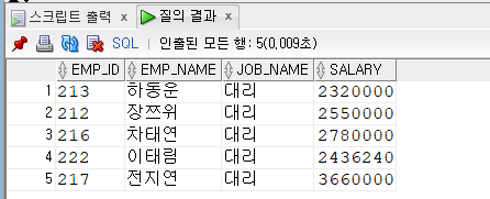 [ 급여를 350만원보다 많이 받고 600만원보다 적게 받는 직원 이름과 급여 조회 ]