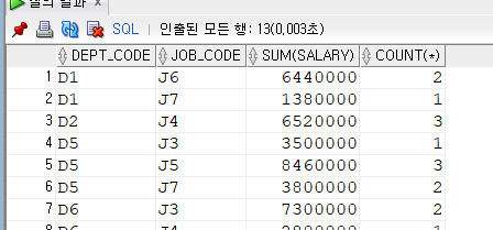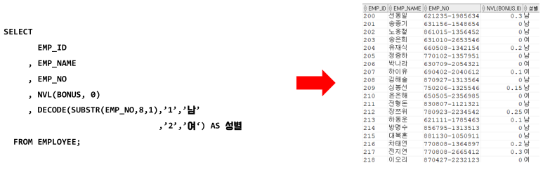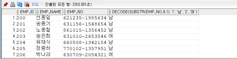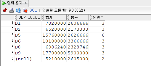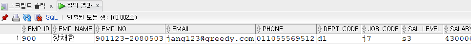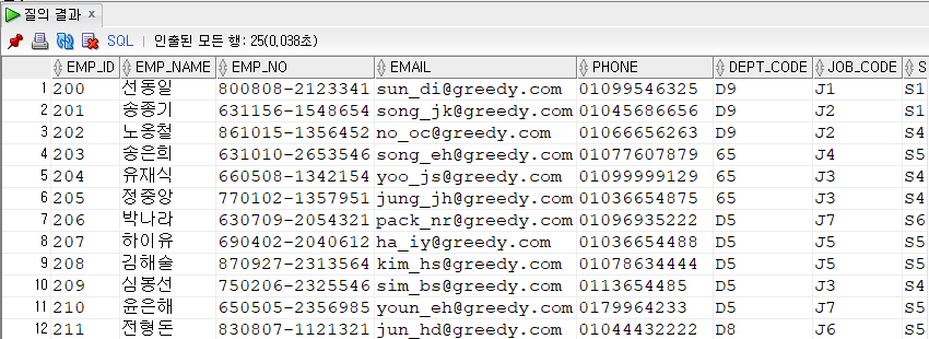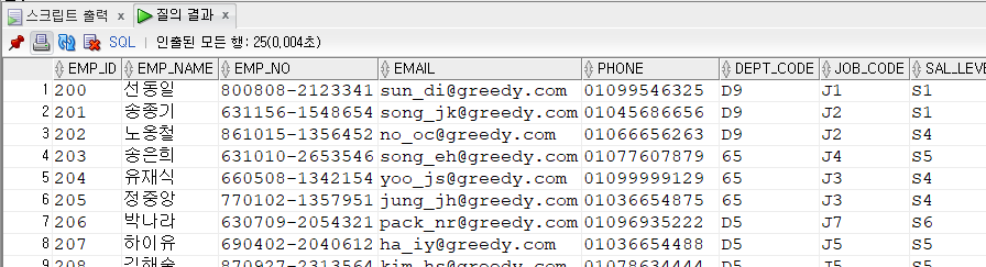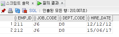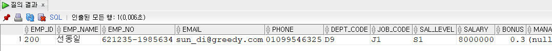 -- 직원의 이름, 주민번호, 부서코드 조회
