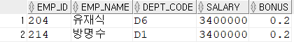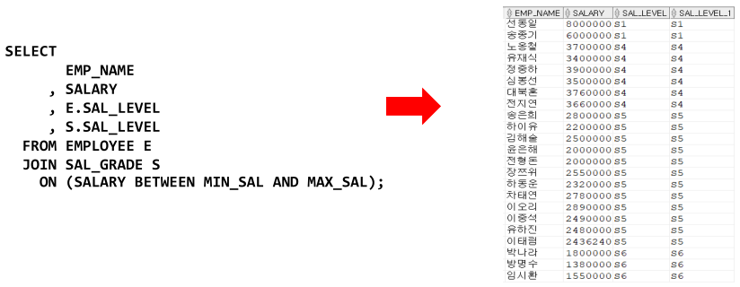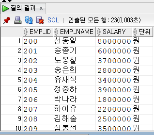 -- 컬럼명 BETWEEN 하한값 AND 상한값