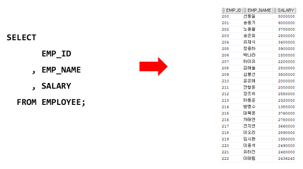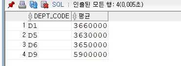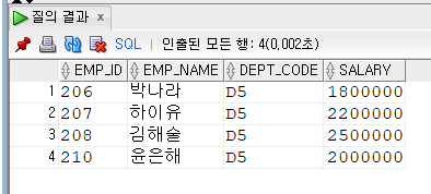 -- 직원의 사번, 이름, 부서코드, 급여를 조회하세요.