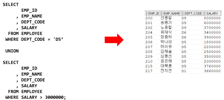 -- 부서코드가 'D6'이거나 'D8'인 직원의