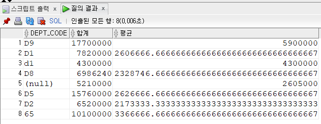 -- 부서코드가 'D6'이거나 'D8'인 직원을 제외한 나머지 직원의