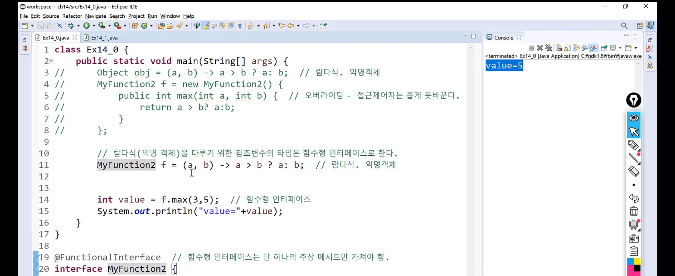 MyFunction인터페이스에 정의된 메서드 max()는 람다식 ‘(int a, int b) -〉a 〉b ? a : b’과 메서드의 선언부가 일치한다. 그래서 위 코드의 익명 객체를 람다식으로 아래와 같이 대체할 수 있다