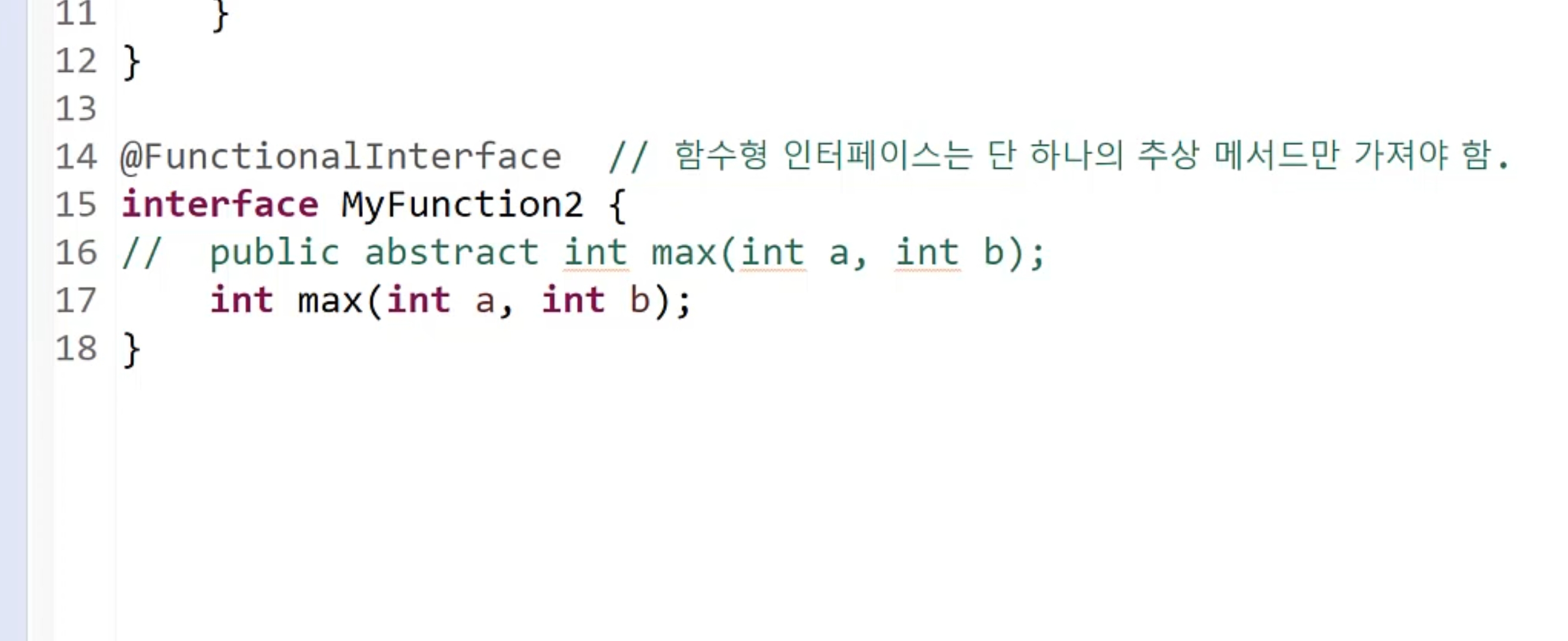 아래와 같이 max()라는 메서드가 정의된 MyFunction인터페이스가 정의되어 있다고 가정하자