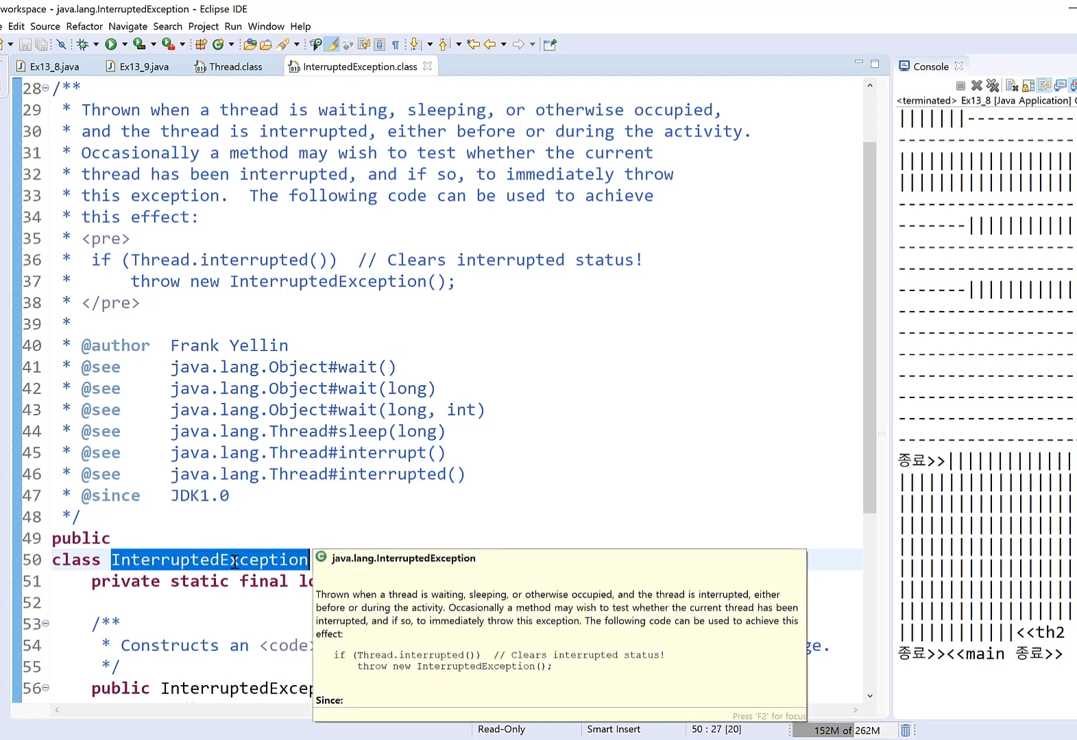 그래서 sleepO을 호출할 때는 항상 try-catch문으로 예외를 처리해줘야 한다.