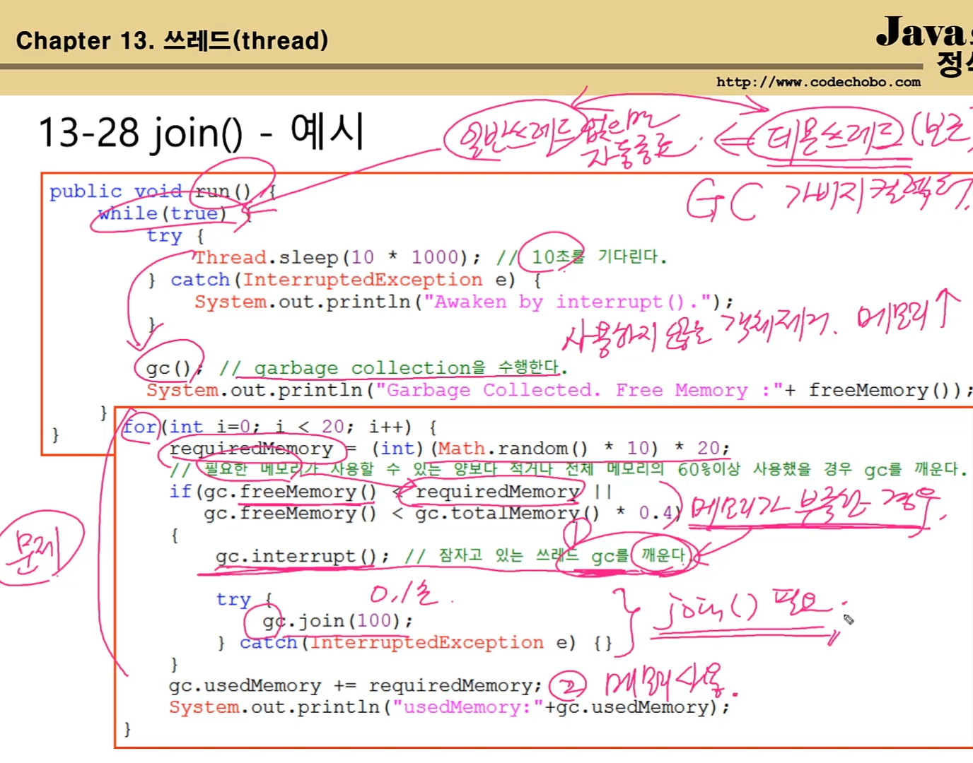 join()도 sleep()처럼 interrupt()에 의해 대기상태에서 벗어날 수 있으며, join()이 호출 되는 부분을 try-catch문으로 감싸야 한다.