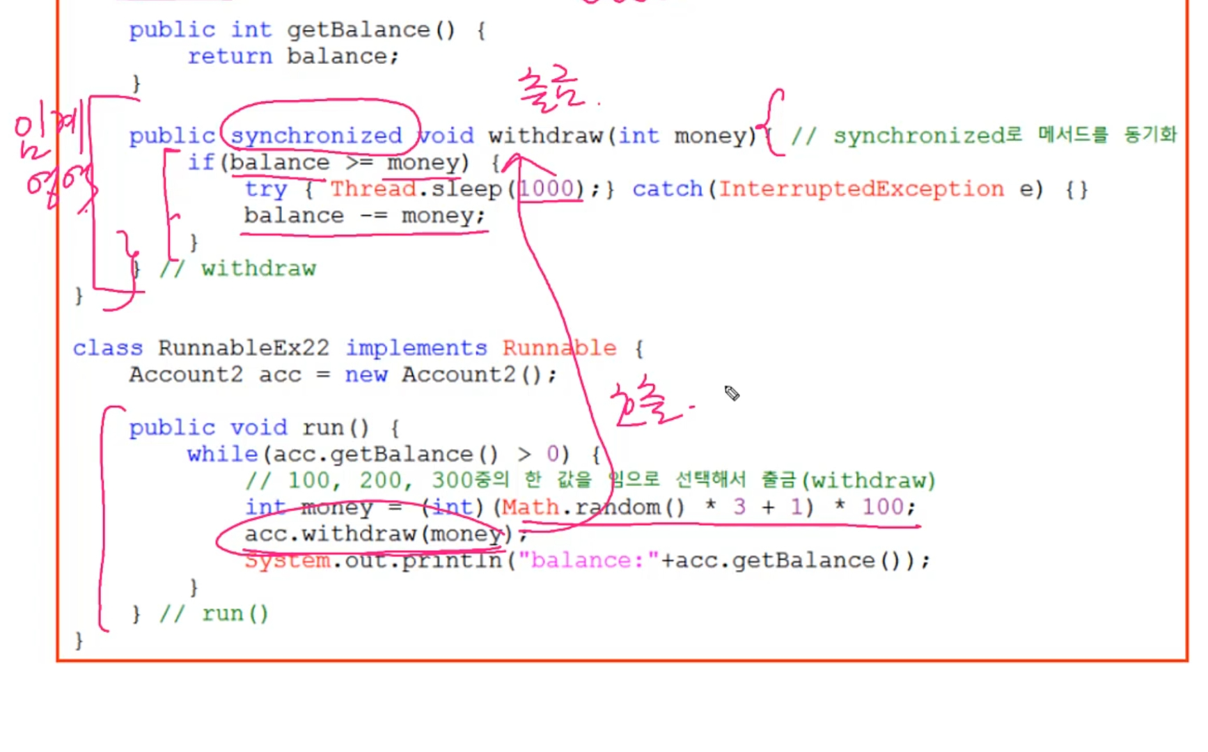 그 이유는 한 쓰레드가 if문의 조건식을 통과하고 출금하기 바로 직전에 다른 쓰레드가 끼어들 어서 출금을 먼저 했기 때문이다.