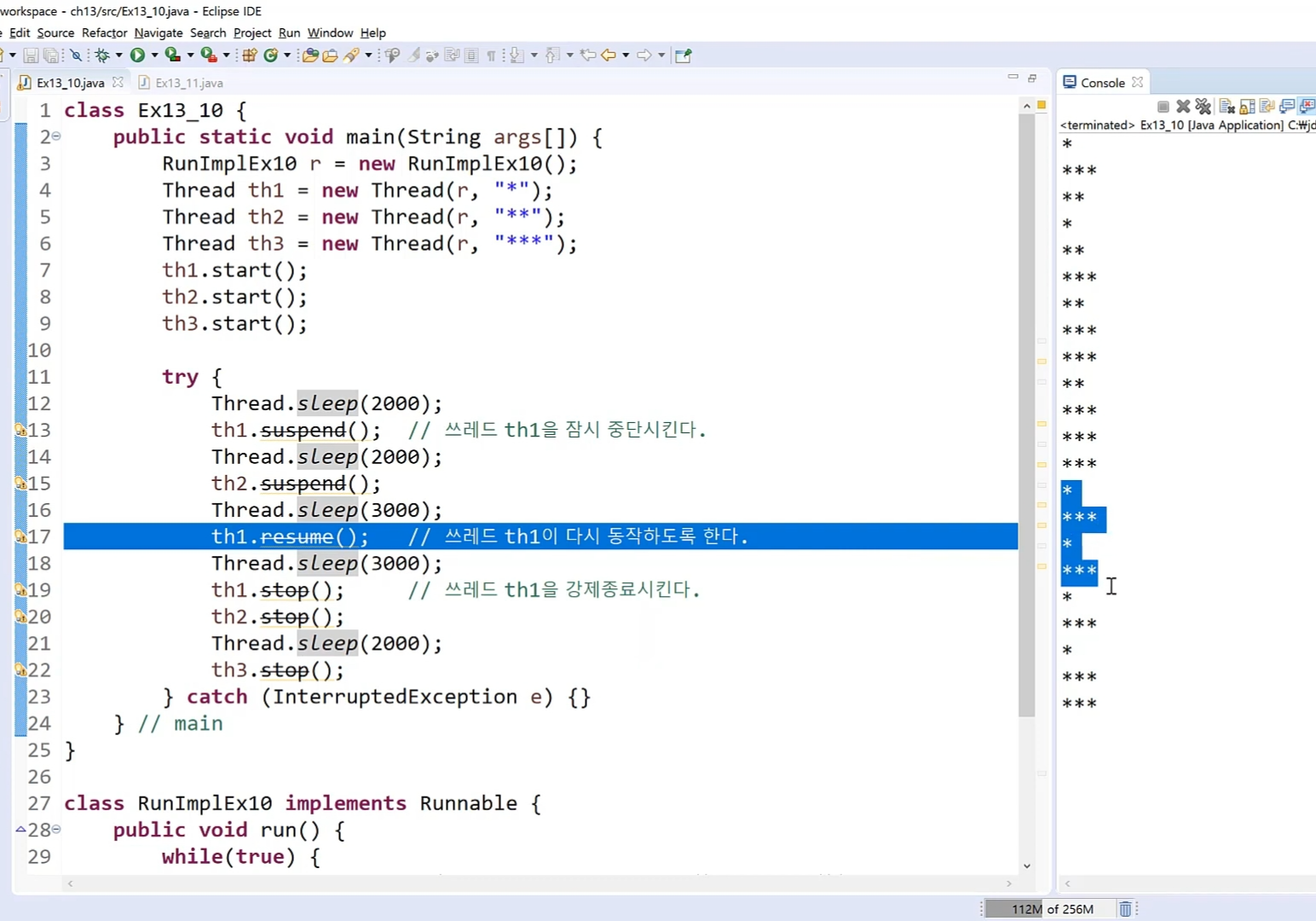 suspend()에 의해 정지된 쓰레드는 resume()을 호출해야 다시 실행대기 상태가 된다.