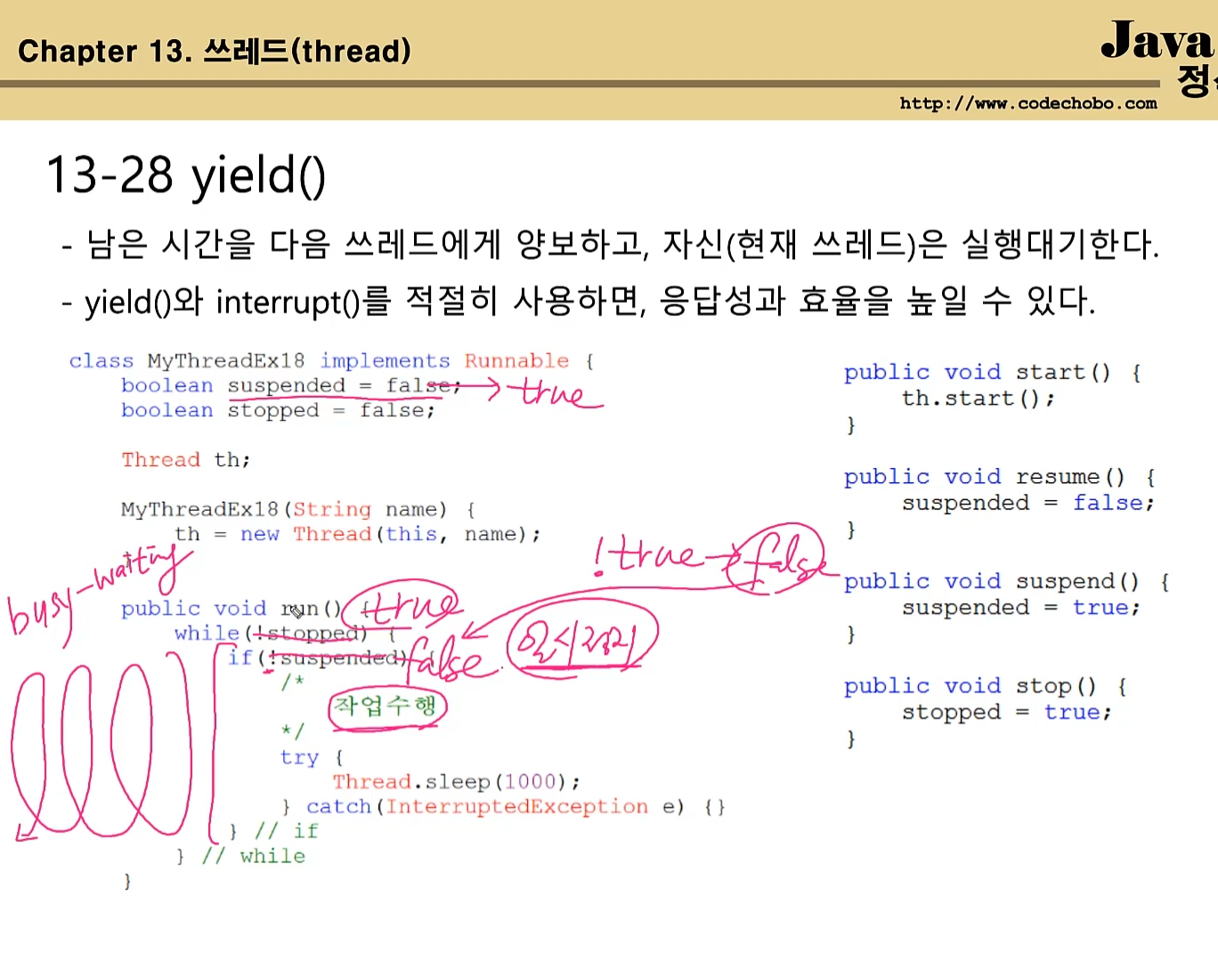 yield()는 쓰레드 자신에게 주어진 실행시간을 다음 차례의 쓰레드에게 양보(yield)한다.