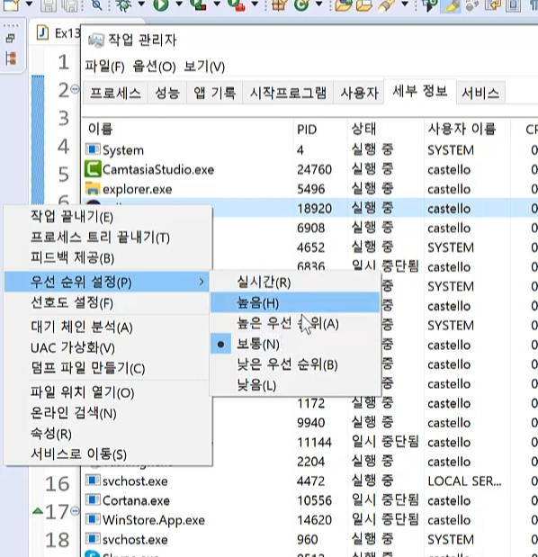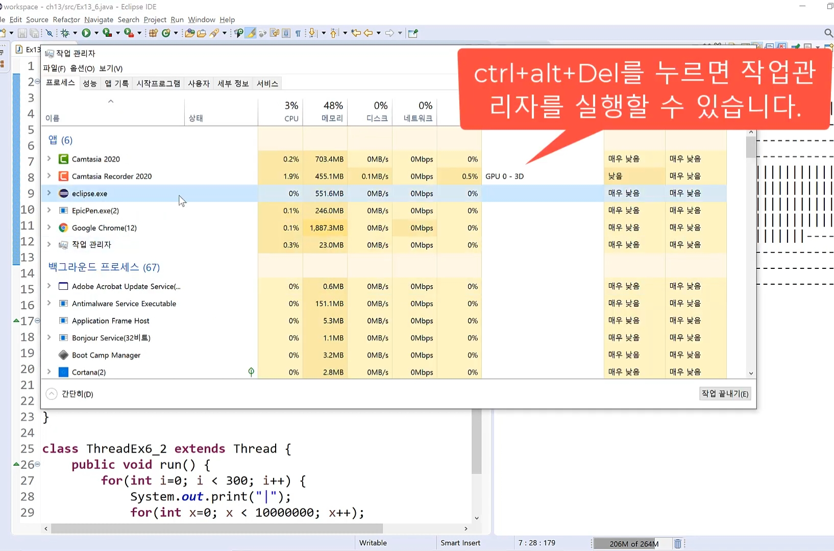 그러나 멀티스레드로 작성시 두 작업이 번갈아 실행된다.