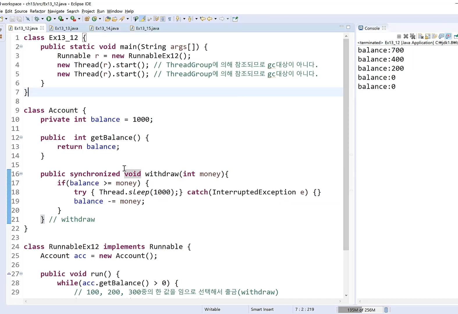 withdraw메서드에 synchronized키워드를 붙이기만 하면 간단히 동기화가 된다.