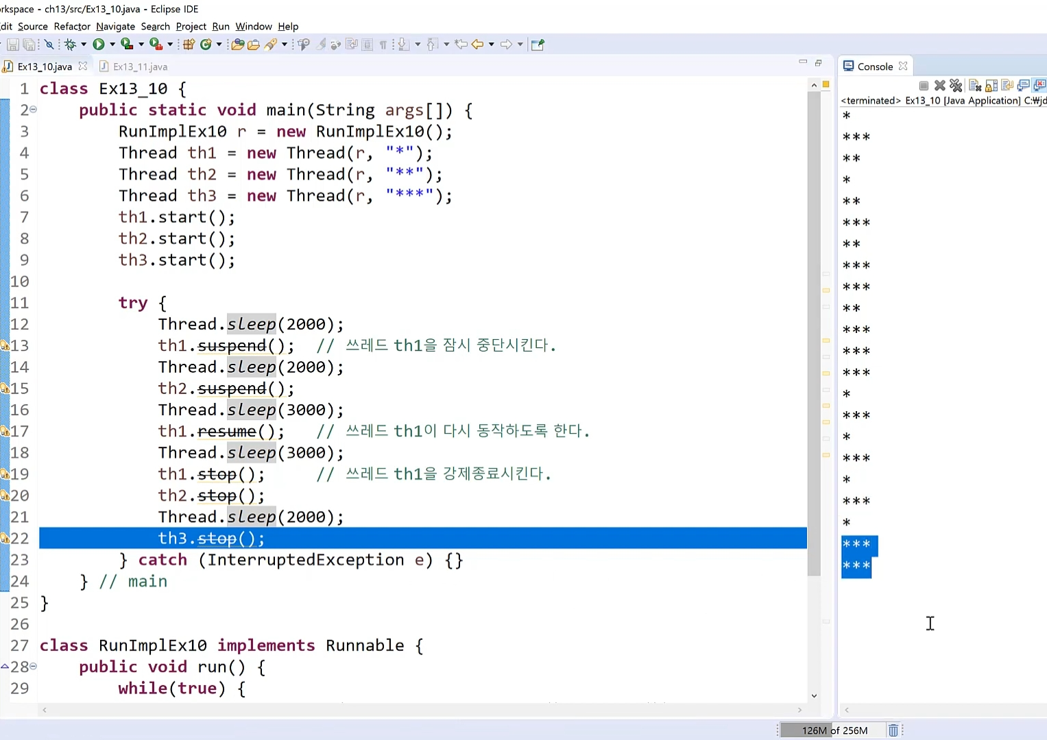 한 가지 더 알아 두어야 하는 것은 한 번 실행이 종료된 쓰레드는 다시 실행할 수 없다는 것이다.
