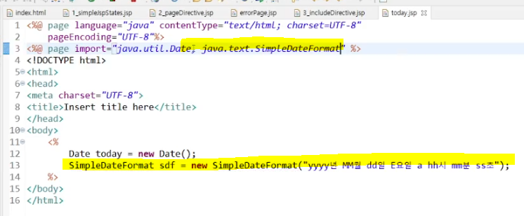 today.jsp 페이지 내 스크립틀릿 코드 안에 DATE 객체를 작성하는데, 이때는 임포트 되지않았으므로 에러가 발생할 것이다.