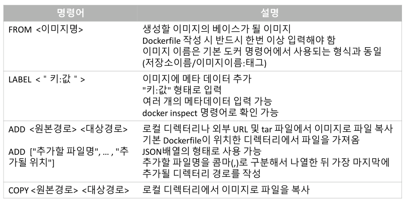 컨테이너에서 수행해야 할 작업을 명시 정해진 형식과 명령어로 작성해야 함 문서 파일로 작성 한 줄에 하나의 명령어로 구성 명령어를 명시하고 뒤에 옵션을 추가 명령어는 대/소문자 상관없음(일반적으로 대문자로 표기) 위에서 아래로 한 줄씩 차례대로 실행됨 주석은 # 기호를 사용