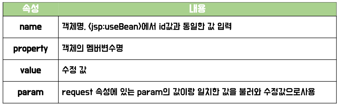 자바빈 객체의 속성값을 설정하거나 수정할때 사용
